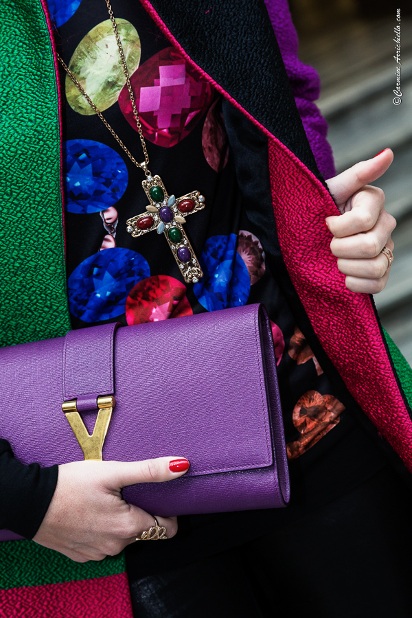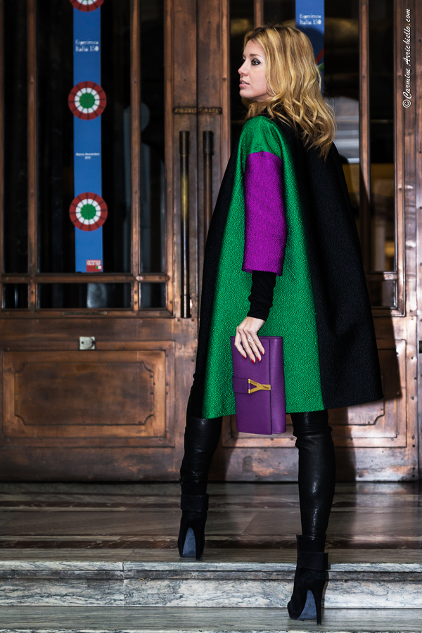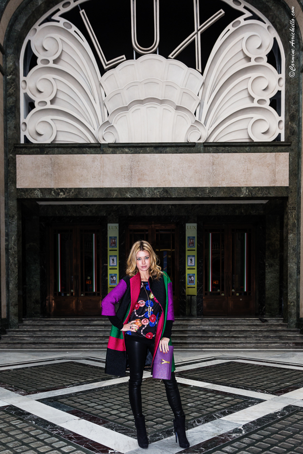Color blocks even for this winter, for an outfit with a silk bon ton coat combined with the jersey with coloured gems and the black leather trousers, that contrasting make the whole thing more aggressive. I choosed as Location “my” Turin, exactly the San Federico Galler. Tres tres chic.